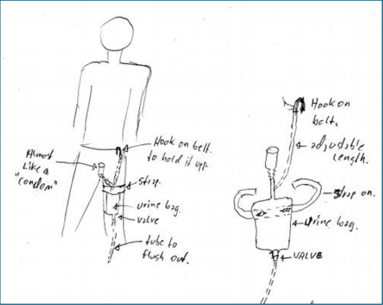 Þvagpoki með slöngu er hengdur í buxnastreng og festur með þunnum “strappa” utan um læri, og á hinum enda slöngu er “lím-smokkur” lím-smokk er rennt upp á tippi og límist við það. Þetta er búnaður sem er búinn til fyrir þá sem ekki komast á venjulegt salerni, t.d. fatlaðir, sjúklingar osfv.